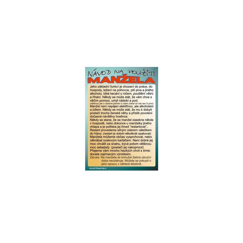 Neví vaše kamarádka jak naložit se svým manželem? V tom případě je tento dárek ideální. Návod na použití manžela je ideální dárek i na svatbu.