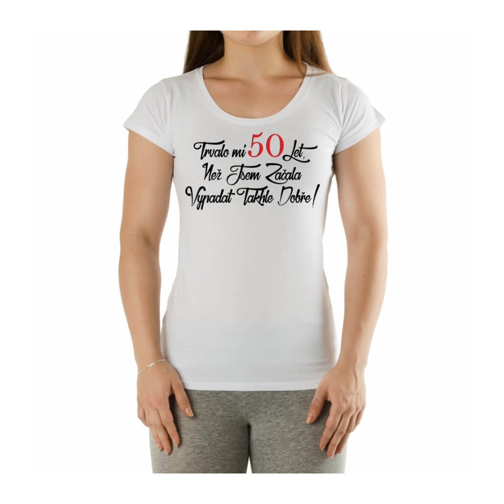 Hľadáte originálny darček ku guľatým narodeninám, ktorý oslávenkyňu neurazí a zároveň bude užitočný? Potom je toto dámske tričko s potlačou tou najlepšou voľbou. Kvalitné dámske tričko s nápisom “Trvalo mi 50 let, než jsem začala vypadat takle dobře”. Tričko je strednej gramáže s guľatým výstrihom, bez bočných švov, kedy je samozrejmosťou dvojité prešitie výstrihu, rukávov a dolného lemu. 100% bavlna, plošná hmotnosť 160 - 165 g/m2.