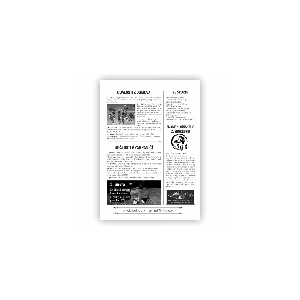 Přečtěte si události z domova, jaké významné osobnosti se narodily ve stejném roce, nebo jaká byla nejoblíbenější jména. Tento nevšední dárek vám připomene filmové novinky i oblíbené hity. Dozvíte se i události z domova a zahraničí.