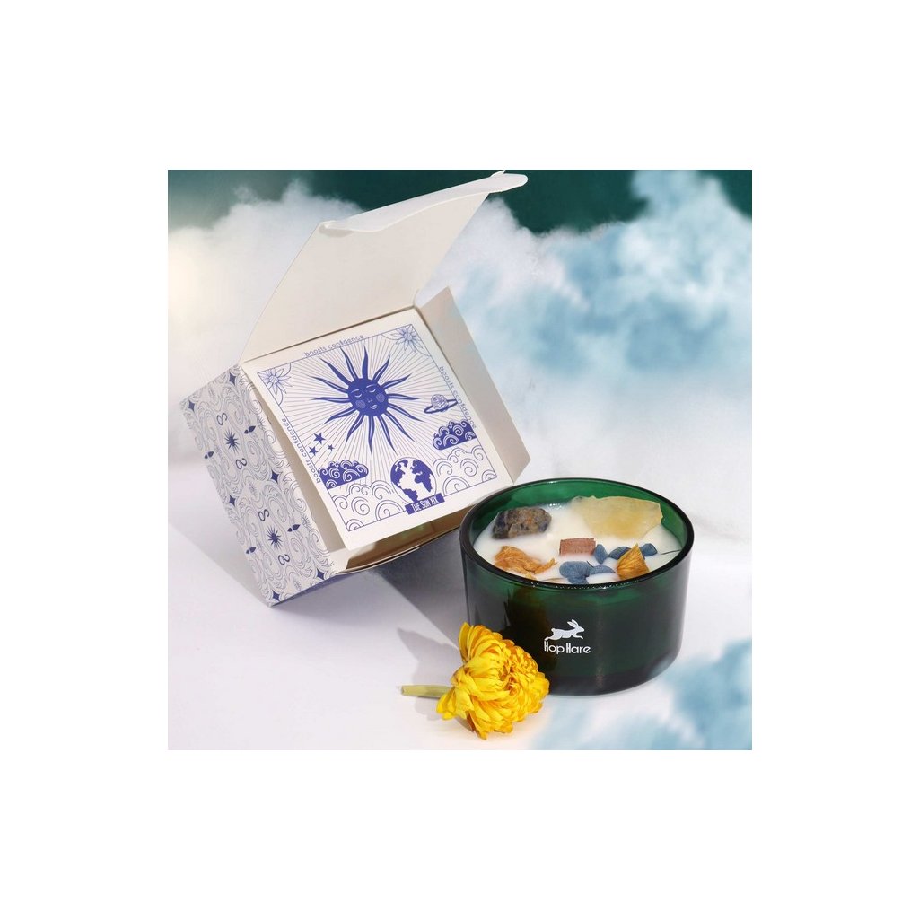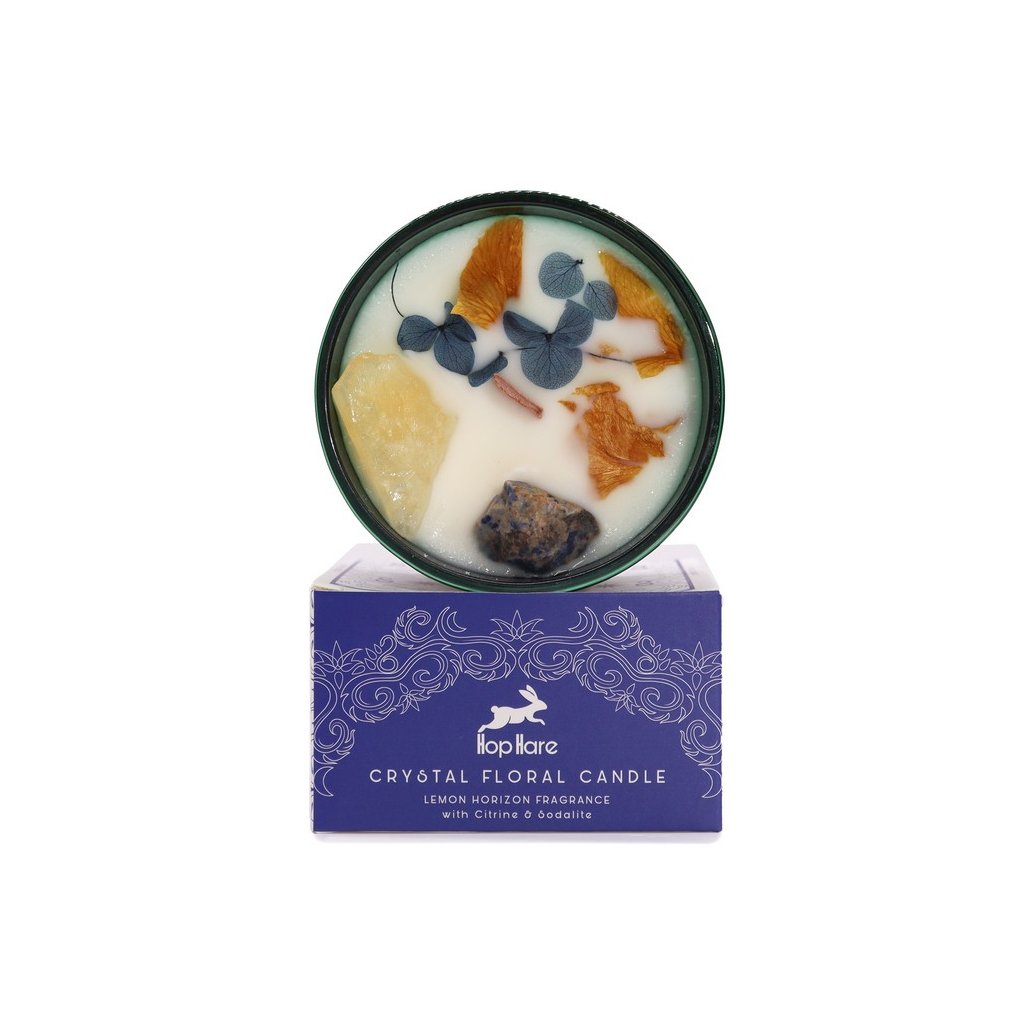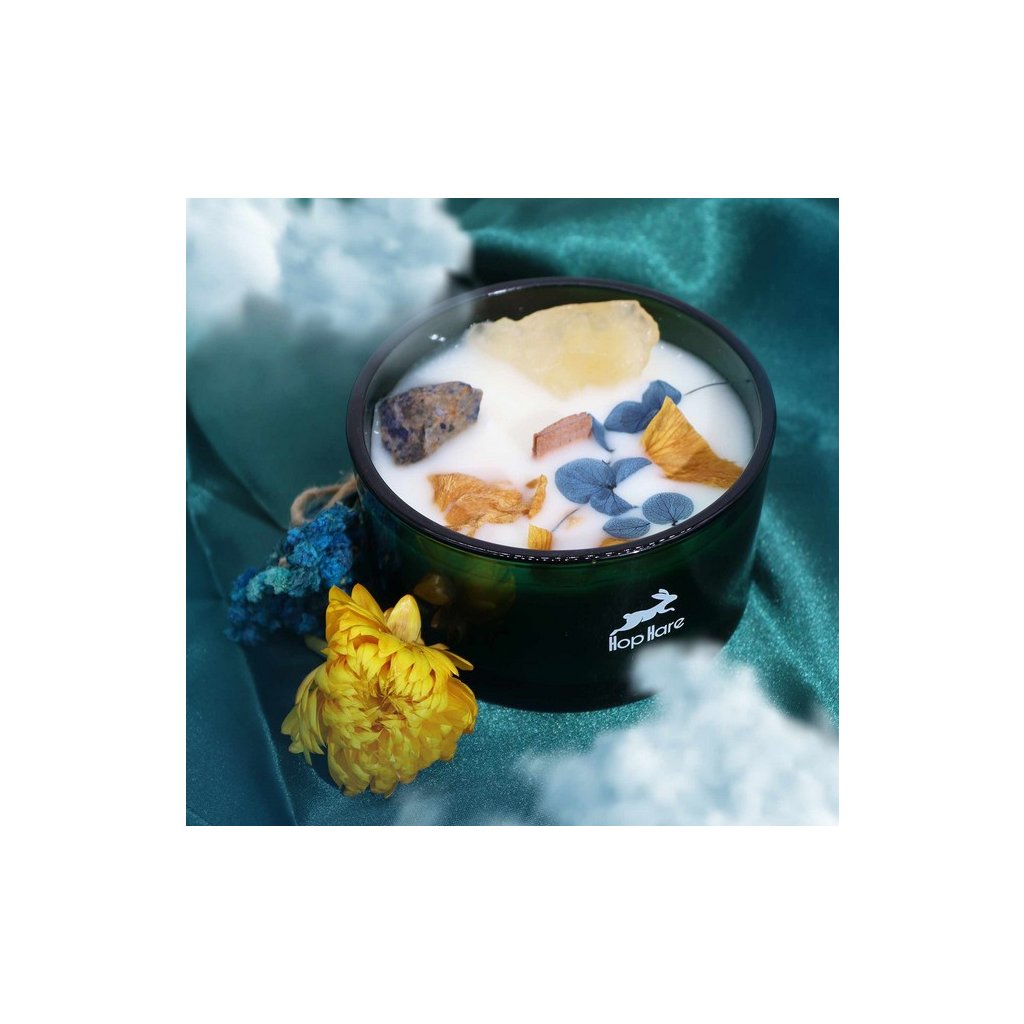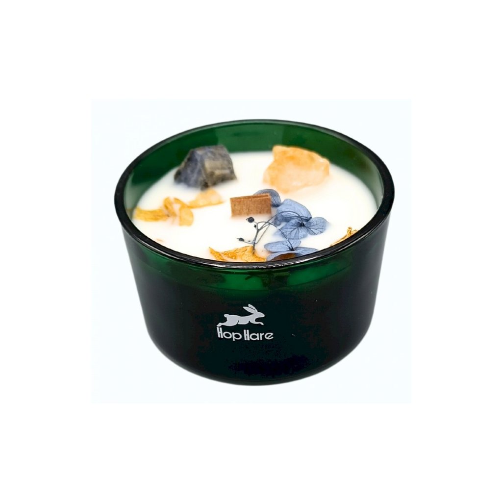 Citrín, známý jako „kámen úspěchu“, se snoubí s harmonizující energií sodalitu a vytváří prostor naplněný optimismem a radostí. Osvětlete své okolí pomocí Slunce a naplňte svůj prostor výbuchem energizující blaženosti. Zvedněte svou náladu, podpořte pozitivitu a vytvořte veselou atmosféru. Každá křišťálová kouzelná svíčka Hop Hare, uzavřená v tmavě zelené skleněné nádobě s rustikálním dřevěným knotem, je jedinečným mistrovským dílem. Odhalte kouzlo uvnitř, když objevíte drahokam doprovázený posypem menších drahokamových úlomků, čímž vytvoříte oslnivou přehlídku přírodních zázraků.