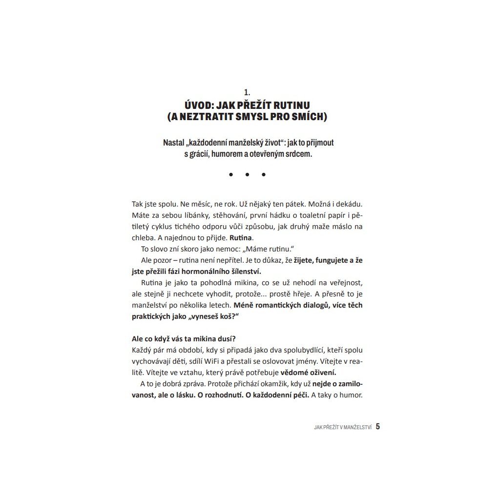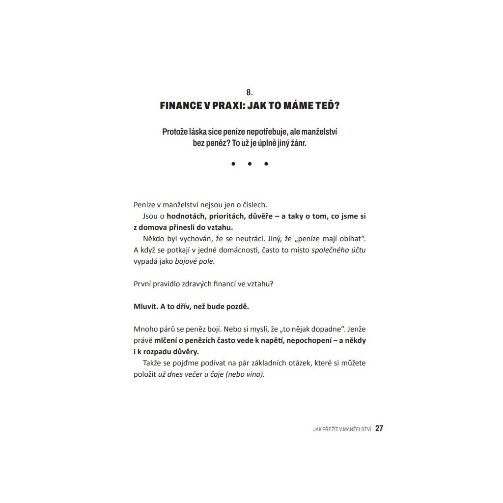 Manuál pro každého, kdo se chce nezbláznit z manželství – a přitom ho žít naplno.Pro čerstvé novomanžele i zkušené harcovníky. Pro všechny, kdo vědí, že vztah se nepřepisuje – ale opravuje. S úsměvem.