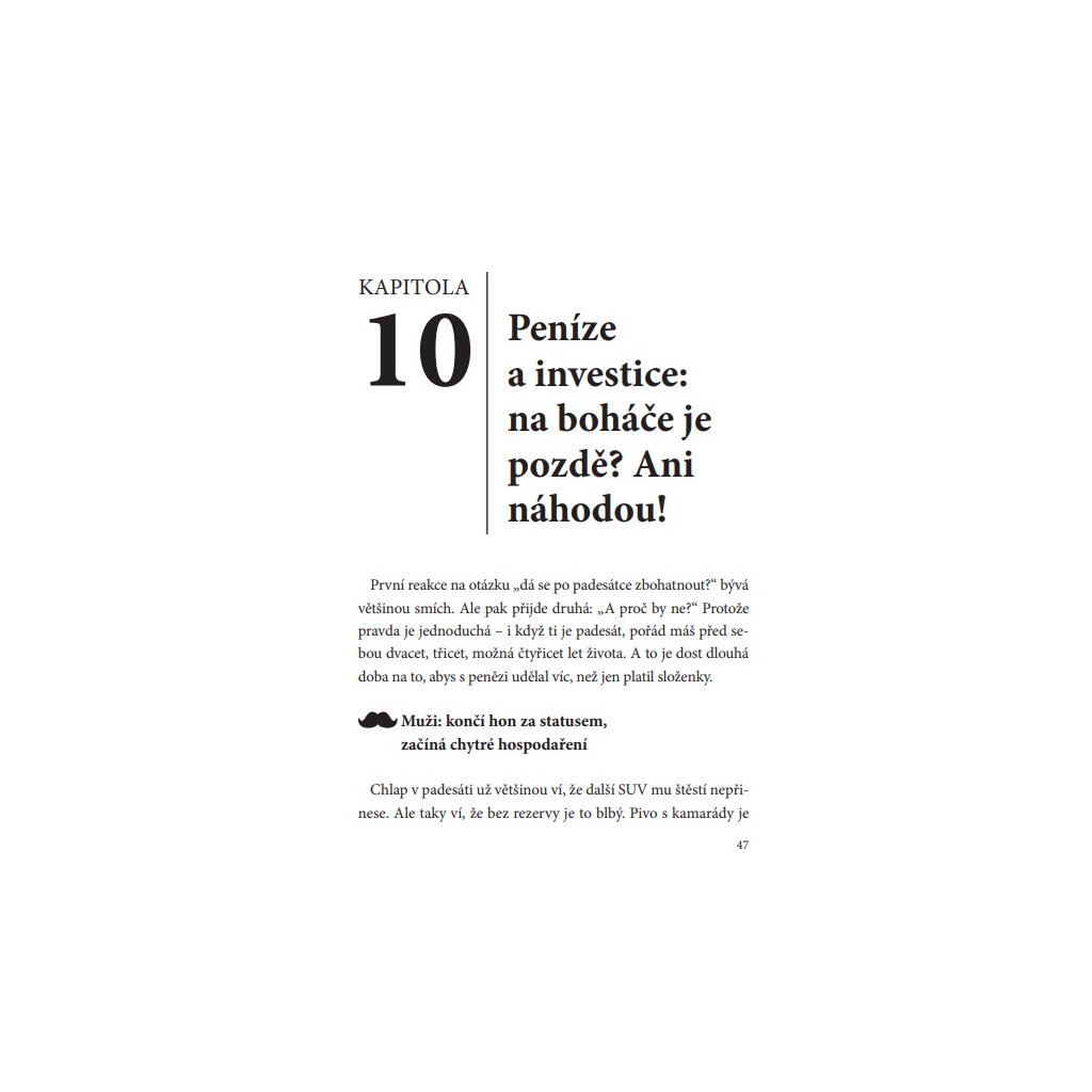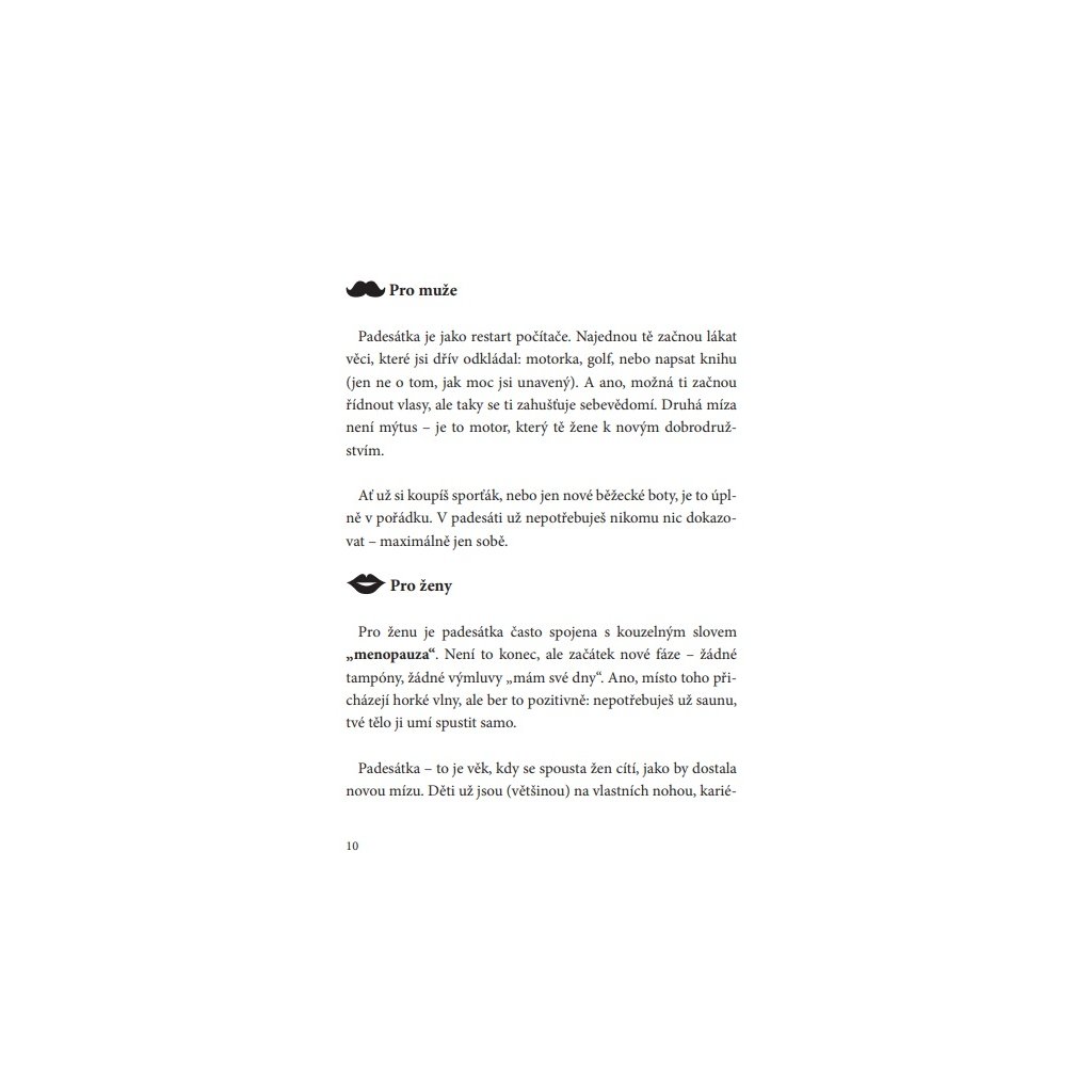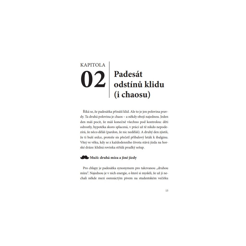 Kniha je rozdělená na pohled mužů i žen, takže každý si v ní najde svůj kousek pravdy – někdy syrový, jindy k smíchu, ale vždycky lidský a povzbudivý.