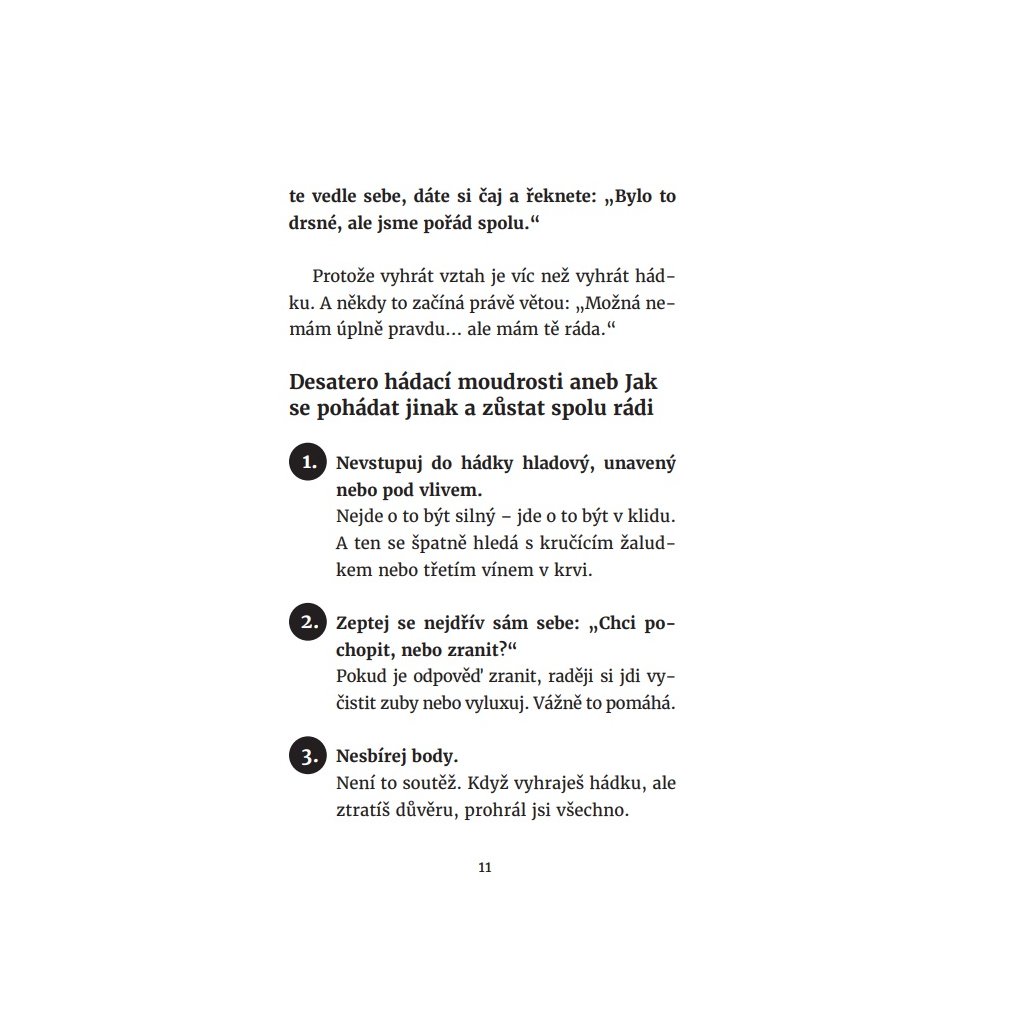 Pravidla hádky – Příručka, jak se pohádat a neztratit lásku. Každý vztah občas zaskřípe. Rozdíl je jen v tom, jestli z hádky uděláte bitevní pole – nebo prostor k porozumění. Tahle kniha vám ukáže, že i bouřky ve vztahu můžou posílit lásku.