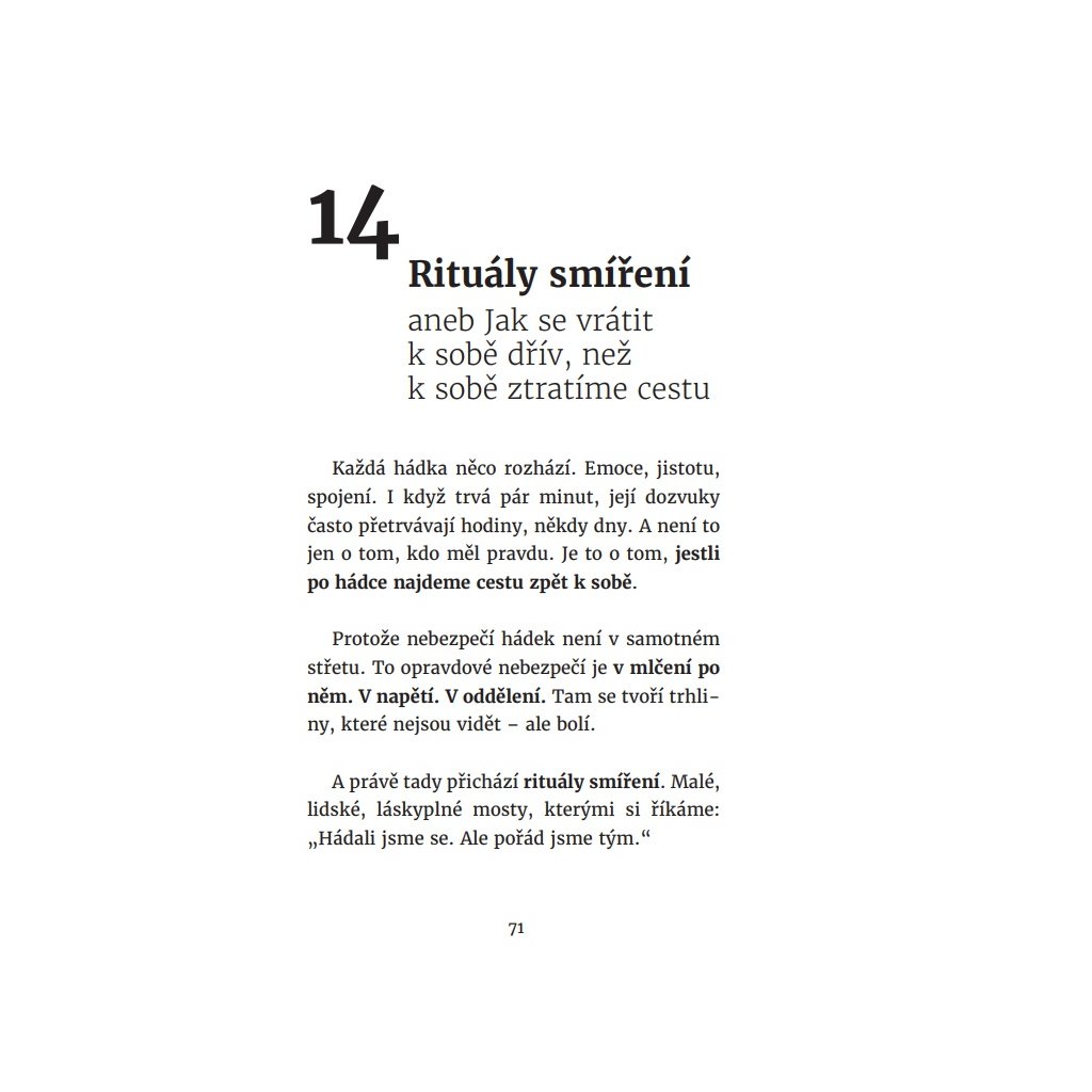 Naučíte se rozpoznat spouštěče, používat „já-věty“, domluvit si STOP-slovo, zvládat digitální hádky i hledat cestu zpět pomocí rituálů smíření. Hlavní část knihy tvoří Desatero, díky kterému se z každé hádky může stát dialog místo války. Prakticky, stručně, s humorem a respektem – aby doma bylo méně napětí a více blízkosti.