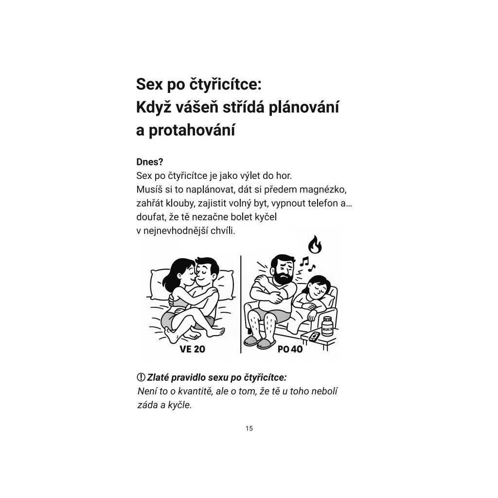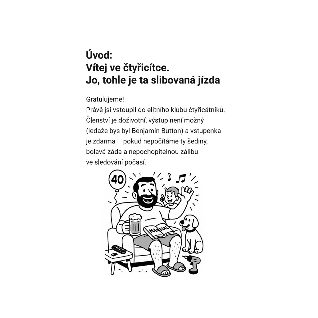 20 kapitol plných smíchu, trefných postřehů a pravd, které bolí (zhruba jako kolena po výstupu do druhého patra). Dozvíš se, proč je sex po čtyřicítce sport na plánování, jak přežít IKEA i kocovinu, a že šediny jsou nový luxusní filtr – jen bez možnosti vypnutí.