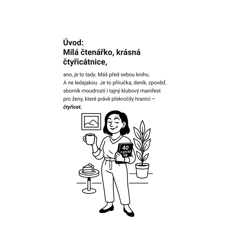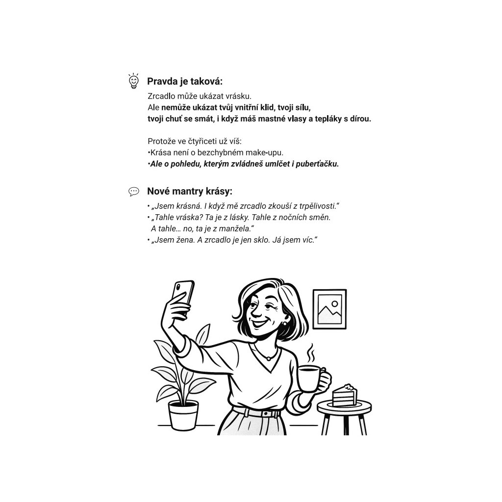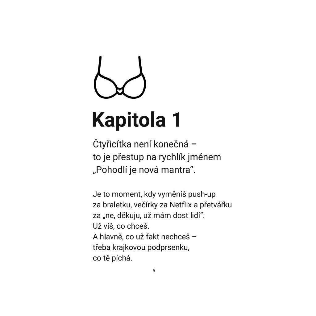 Vítej ve věku, kdy si konečně vezmeš podprsenku podle sebe – ne podle etikety. Tahle kniha je přesně pro tebe (nebo pro kamarádku, ségru, kolegyni), která oslavuje čtyřicítku s nadhledem, ale sem tam potřebuje ujistit, že je pořád božská. A šik!