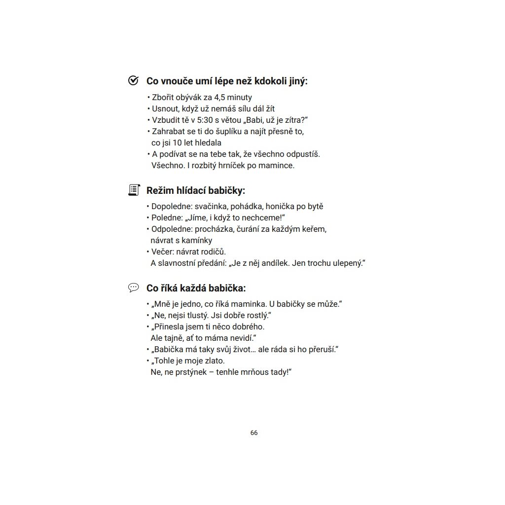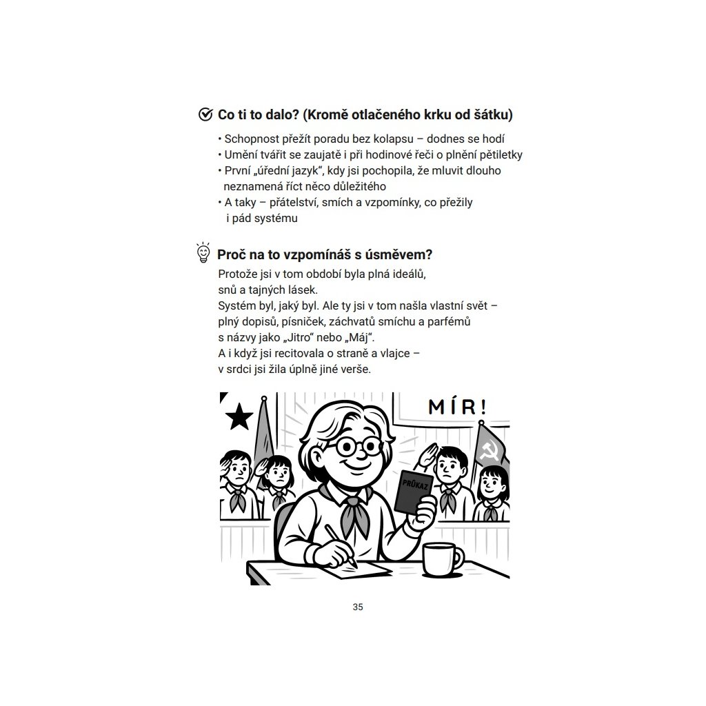 Kniha plná retro vzpomínek, humorných postřehů, upřímnosti a špetky rebelie. Od dětství v sukni a pískovišti přes první lásky a pionýrské šátky, až po babičkovský level se sušenkou v kapse a klidem na duši.
