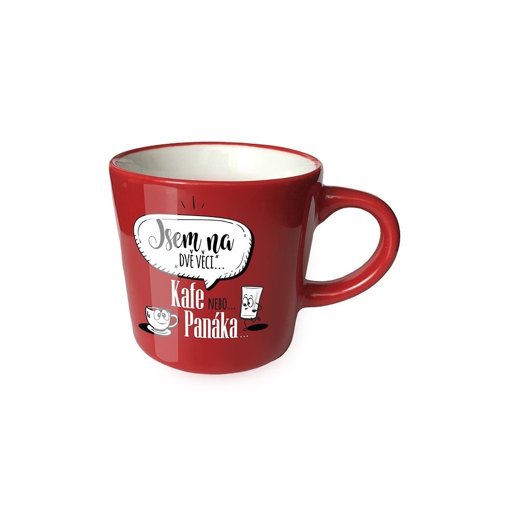 Stylový text na minihrnečku: "Jsem na dvě věci… kafe a panáka."., je skvělým dárkem pro kolegyni, přítelkyni, kamarádku, ségru, nebo maminku. Je čas, zklidnit se a vychutnat si šálek kávy, nebo si dát panáka.