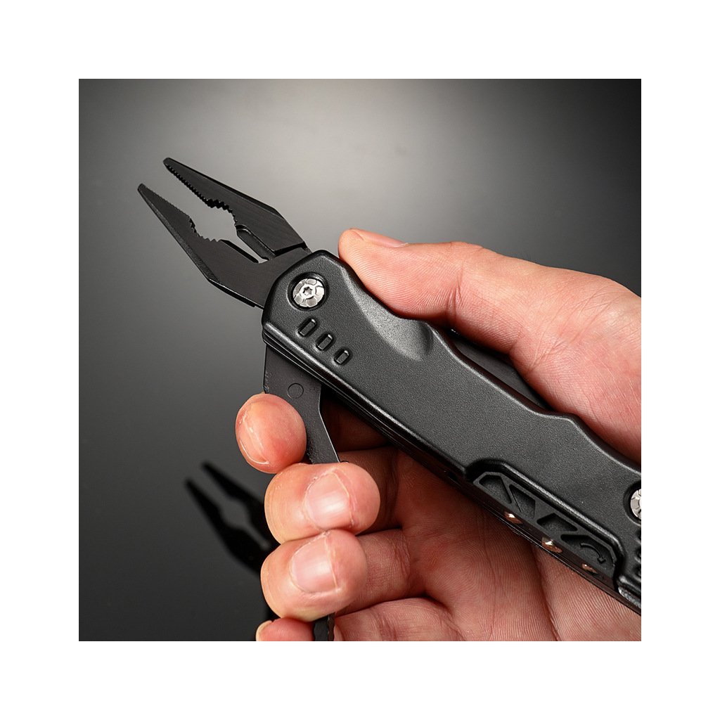 Multifunkční nářadí 18v1 je praktický pomocník na cesty, do přírody i do domácnosti. Díky kombinaci kladiva, nastavitelných kleští, nože, šroubováků, otvíráků a dalších nástrojů budete mít vždy po ruce vše, co potřebujete. Je vyrobeno z vysoce kvalitní uhlíkové oceli s přesným laserovým měřením a protiskluzovou úpravou, takže je pevné, odolné a bezpečné.