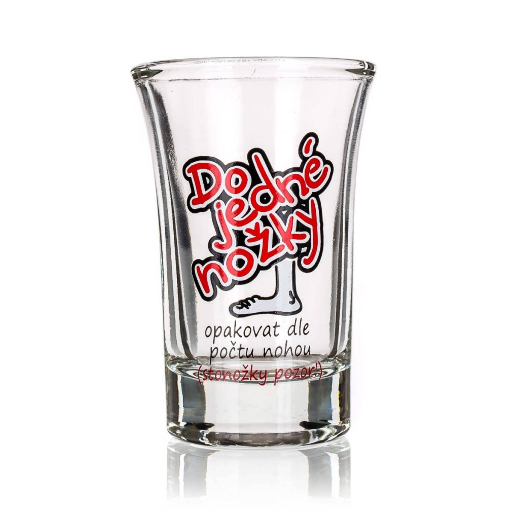 Sklenený panák z edície s humornými textami. Darčekový panák v papierovej krabičke je vhodný pre ženy a mužov so zmyslom pre humor. Vtipný darček k meninám alebo narodeninám. Panák s vtipným textom: „Do jedné nožky“.