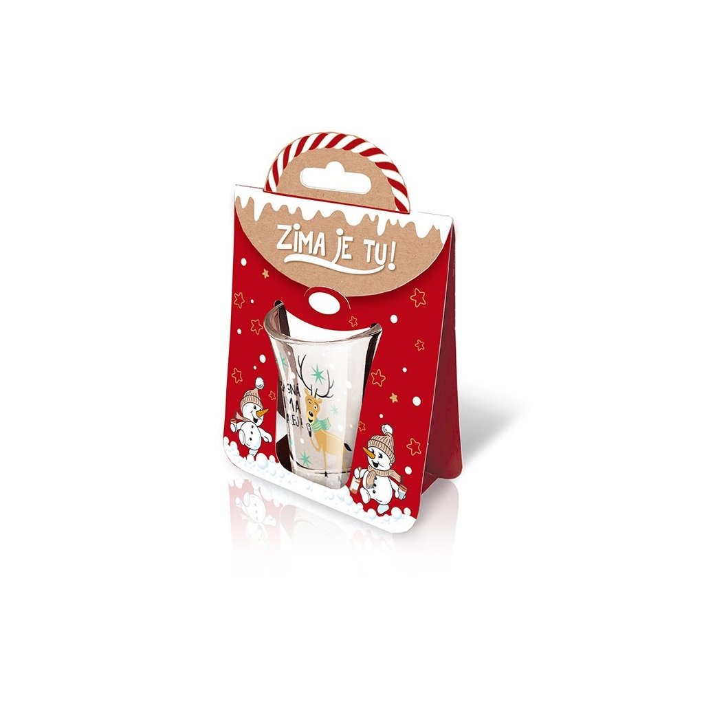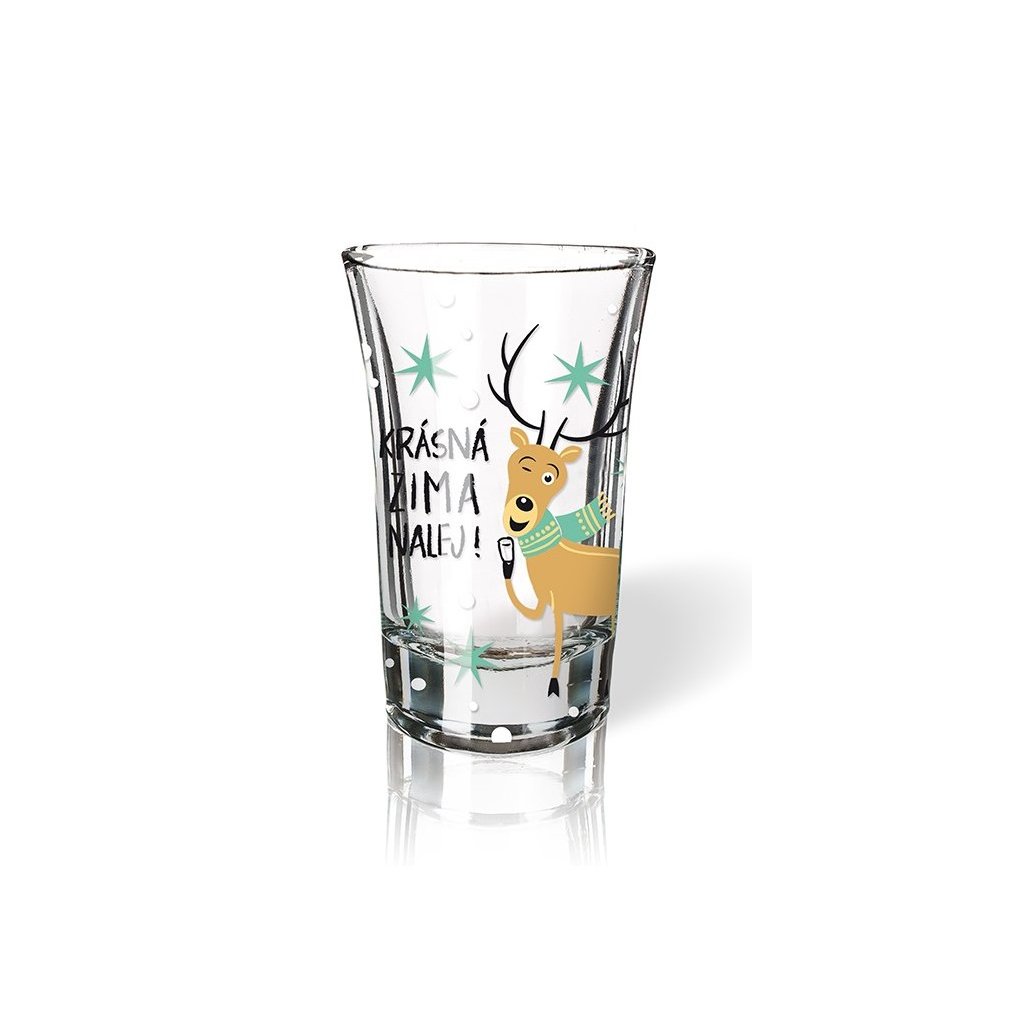 Skleněný panák z Vánoční edice s humorným textem: Krásná zima, nalej!