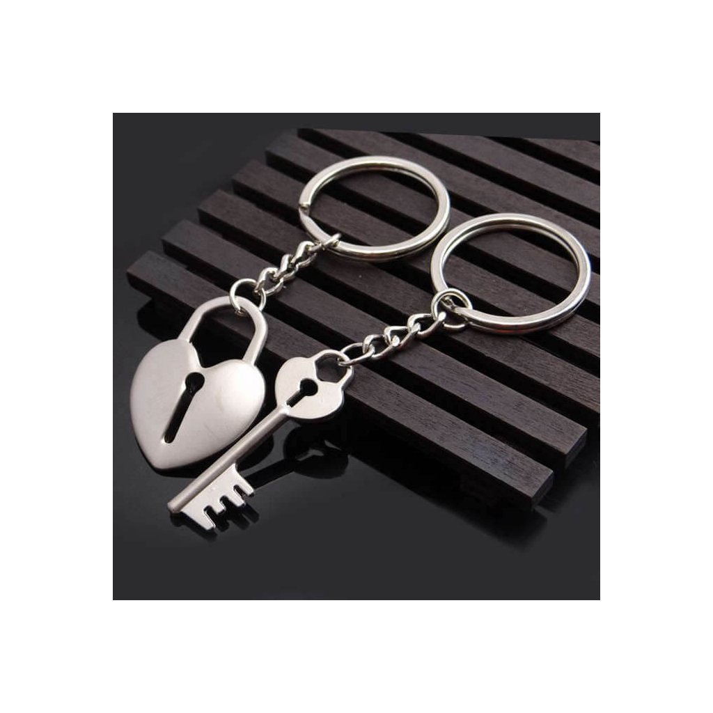 Romantický prívesok na kľúče - srdce a kľúč. Dva prívesky na kľúče (jeden má srdce, druhý z páru ma kľúč). Originálny prívesok na kľúče, ktorý vám bude pripomínať vášho partnera. Materiál: zliatina kovu. Rozmery srdca: 2,5 x 3,5 cm. Rozmery kľúča: 1,5 cm x 4 cm. Dĺžka prívesku: 9 cm. Farba strieborná. Ľahký, obsahuje dva krúžky na kľúče. Prívesok na kľúče pre páry.
