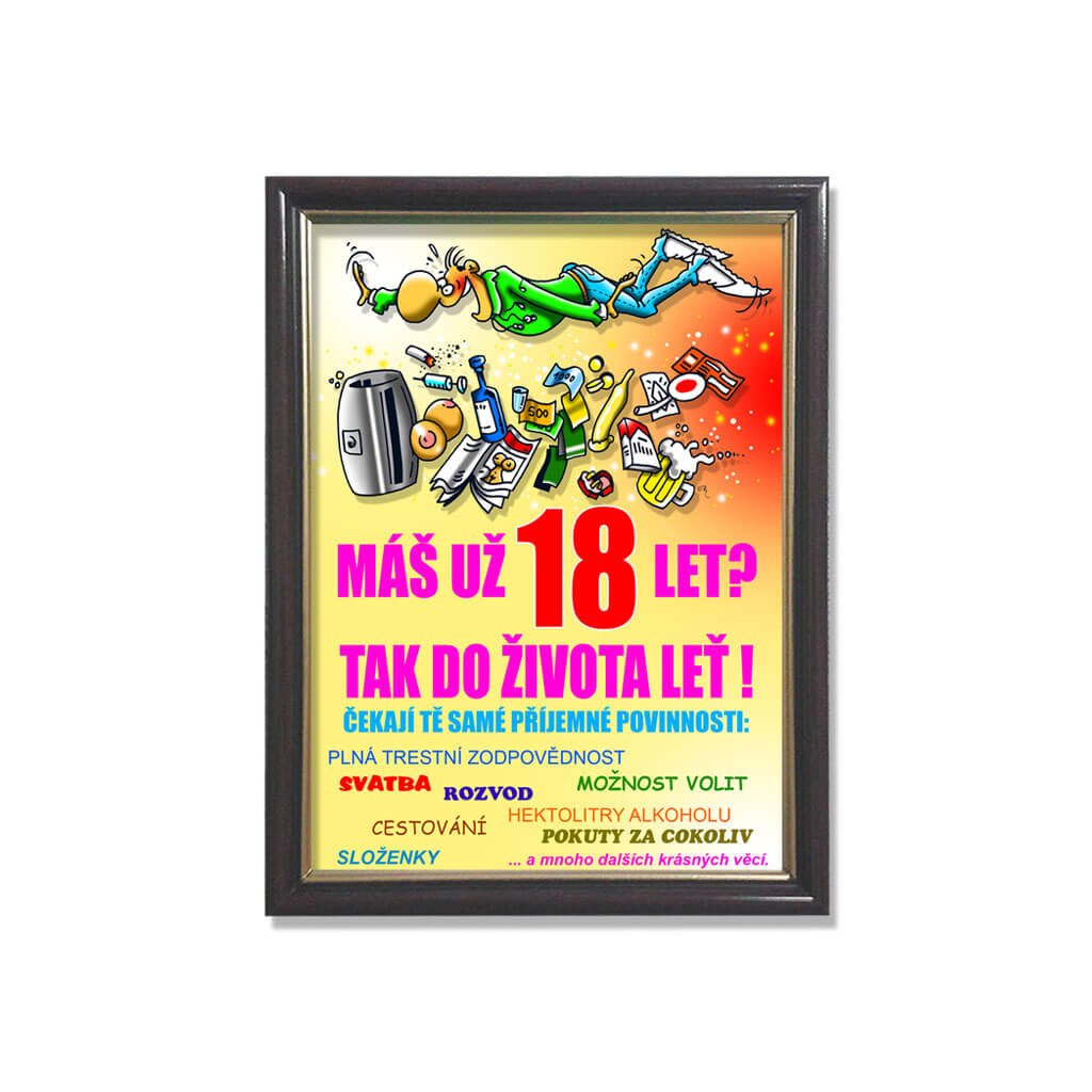 Rámček s humorným textom (v Českom jazyku) pre osemnásťročných. Rámček, ako originálny darček. Rozmery: cca 23 x 18 cm