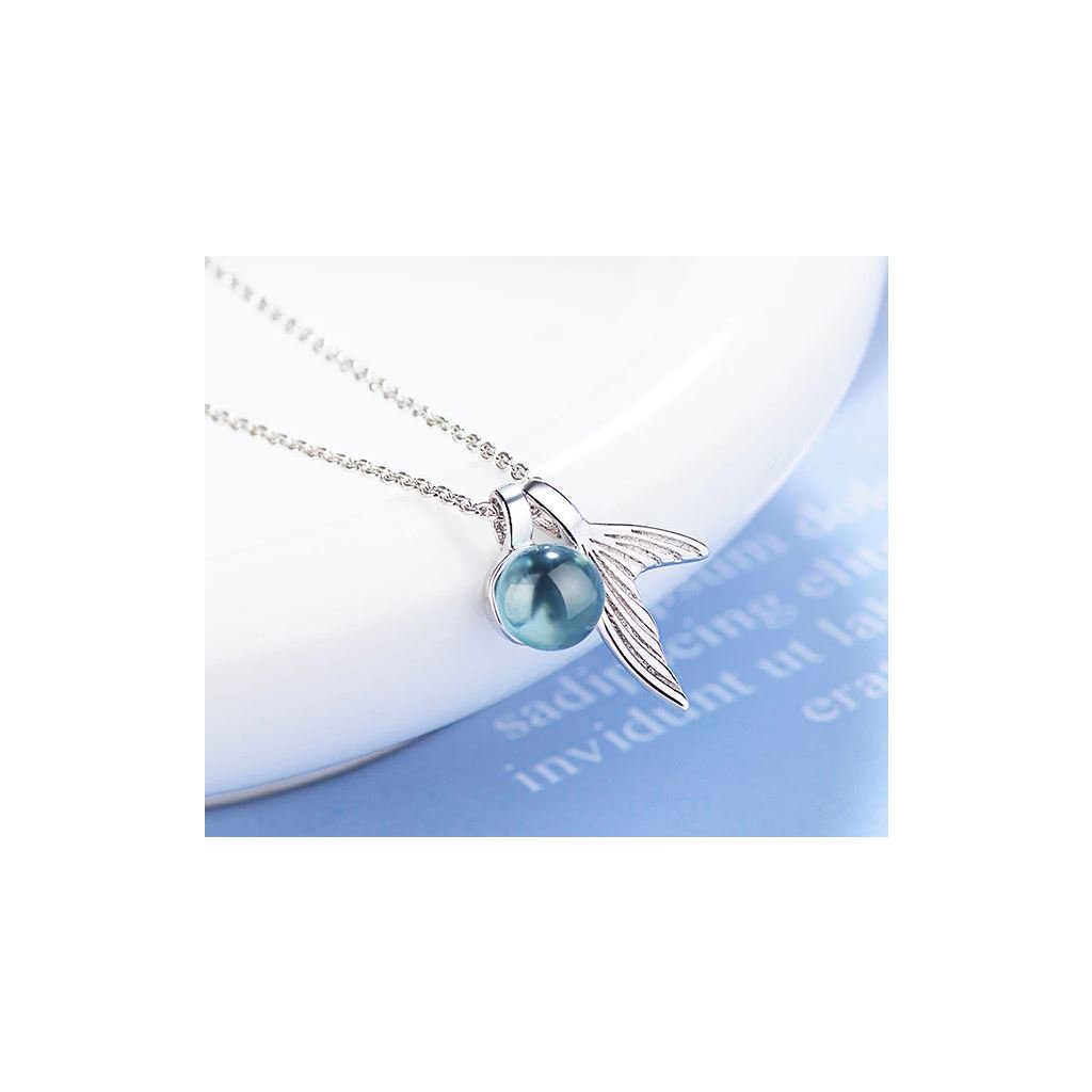 Tematický módny prívesok morskej panny. Krásna a jemná retiazka s príveskom plutvy a modrej guličky pripomínajúca more. Ideálny drobný darček pre ženy k meninám, narodeninám alebo Valentínu. Romantický darček. Rozmery prívesku: 0,6 – 1,6 cm. Dĺžka retiazky: 40 cm s možnosťou prepnutia až na dĺžku 43 cm. Materiál: zliatina kovu. Farba: strieborná a modrá.