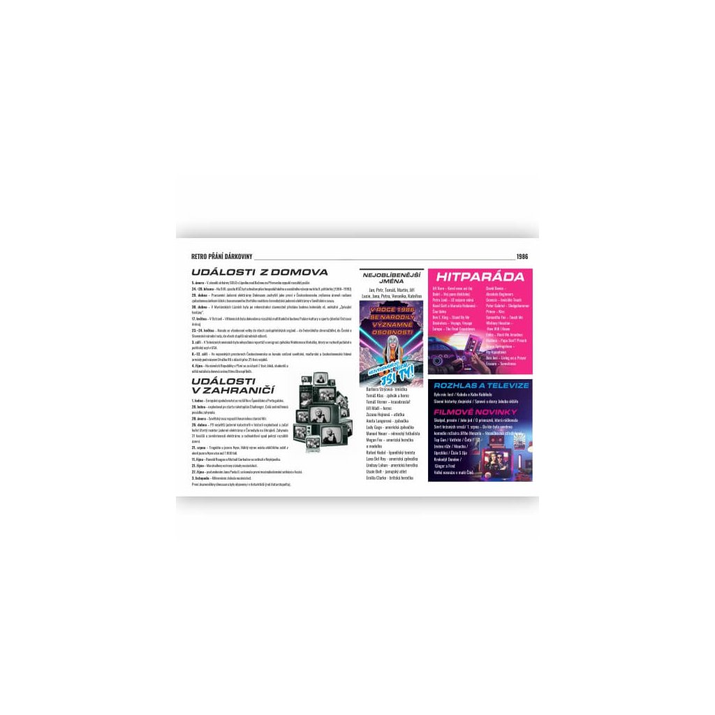 Vrať se do roku 1986 a připomeň si, jak vypadal svět, když ses narodil/a! RetroČasopis 1986 je originální dárek plný nostalgie, humoru i skutečných příběhů z doby, kdy frčely kazety, džíny, céčka a první videopřehrávače.